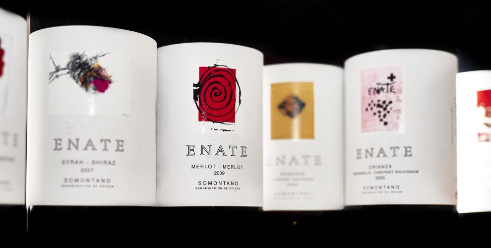Las etiquetas de los vinos de la bodega ENATE han sido, desde la primera botella, una ventana al arte contemporáneo. Durante estos más de veinticinco años que lleva embotellando y etiquetando vinos, han salido de sus almacenes algo más de 62 millones de reproducciones de más de cincuenta obras de arte contemporáneo. 62 millones de ventanas al arte de hoy, muchas de ellas trabajadas en estudios de artistas aragoneses. Cada uno de los vinos está asociado a un autor de reconocido prestigio, que se convierte en su máximo embajador a través de su obra, plasmada pincelada a pincelada en el etiquetado de cada botella. Una etiqueta que, quien escancia, tiene en sus manos la posibilidad de disfrutar de la belleza de una imagen añadida a los complejos sabores y aromas de los vinos.