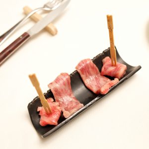 La degustación de carnes dio comienzo con una chuleta de vaca vieja de altísima calidad: vaca gallega “Roxa Douro” madurada 200 días. Después, se pudo disfrutar de cuatro cortes de diferentes razas y procedencias ya de auténtico buey certificado de las tradicionales zonas de España, con largas maduraciones controladas: ABS Chuletón de buey del Valle del Esla madurado 60 días, el auténtico buey de arrastre de Tolosa madurado 90 días, y un buey gallego de campo, ¡con más de 300 días de afinado especial en cámara! Siendo la pieza que mejor maridaba con el ENATE UNO TINTO, un vino poderoso y elegante que se caracteriza por su aroma intenso y muy profundo de fruta roja fresca que reposa sobre una elegante sinfonía de aromas minerales, ahumados, especiados y fenólicos. Además, también pudo degustarse Ito wagyu, buey negro japonés A 5 de Kagoshima, perfecto maridaje con el ENATE UNO CHARDONNAY de destreza frescura y extraordinaria carnosidad.