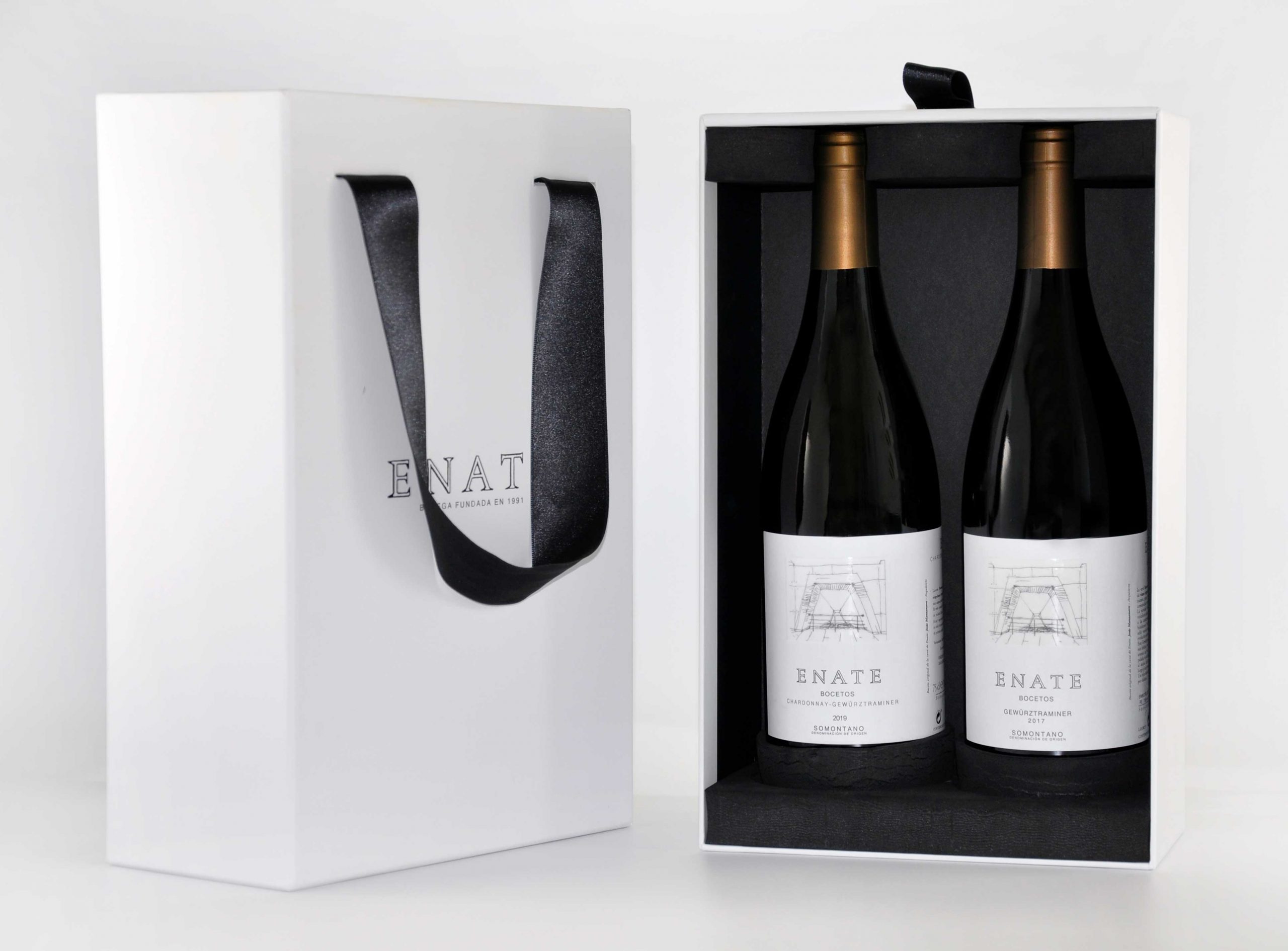 Junto a él, también podremos disfrutar en este estuche de ENATE Chardonnay-Gewürztraminer 2019, que surge de un coupage de distintas uvas y viñedos de chardonnay (70 %) y gewürztraminer (30 %) de la cosecha 2019. Un proyecto exclusivo en ENATE, donde habitualmente las vinificaciones de blancos son siempre propuestas monovarietales. Aquí, las dos variedades reinas del Somontano se unen para dar lugar a un vino con gran personalidad y de muy escasa producción, apenas 3 500 botellas, en el que, una vez más, se ha apostado por cuidar con mimo los detalles para obtener el equilibrio que mejor integre la vitalidad y frescor de la fruta con un ligero y discreto recuerdo de los aromas de torrefacción de la barrica, además de enriquecerlo en tonos lácticos y cremosos. En definitiva, la combinación perfecta entre la agilidad y chispa del chardonnay y los toques florales y especiados tan típicos del gewürztraminer, con un sutil recuerdo de los tostados de una barrica de roble francés de primera calidad. Como colofón, el haber tenido la oportunidad de otorgarle un reposo al vino durante algo más de un año ha permitido el desarrollo de los aromas de la serie anisada, que nos recuerdan al hinojo y al cilantro y, a su vez, ha limado esa nota ligeramente amarga que pueden presentar algunos vinos de chardonnay cuando se lanzan de manera precoz al mercado. El regalo perfecto para aquellos que buscan sorprender y dejarse sorprender. ¿Dónde puedes adquirirlo? En tiendas especializadas o en la tienda física de la bodega.