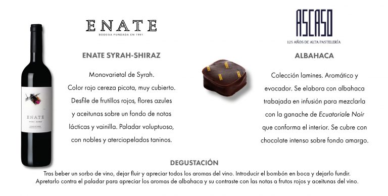 Te proponemos esta apuesta creativa en la que los vinos de ENATE se maridan con bombones de Pastelería ASCASO. Hoy, os dejamos un nuevo maridaje: ENATE Syrah-Shiraz con la propuesta de ASCASO para este vino: Bombón Albahaca.