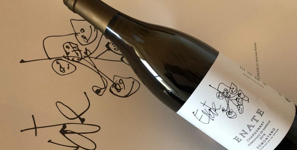 Y es que Saura fue el primer artista que vistió una de nuestras botellas, la del ENATE Chardonnay Barrica La etiqueta es la unión de dos cuadros en tinta sobre papel: el racimo, con siete granos de uva, y el grafismo de ENATE. Los dos cuadros que más le gustaban al propio Saura. Una obra que se ha convertido en el tiempo en uno de los símbolos con los que, sin duda, se identifica a ENATE. Hoy, en nuestra colección tenemos un total de ochos grafismos y ocho racimos de su autoría.