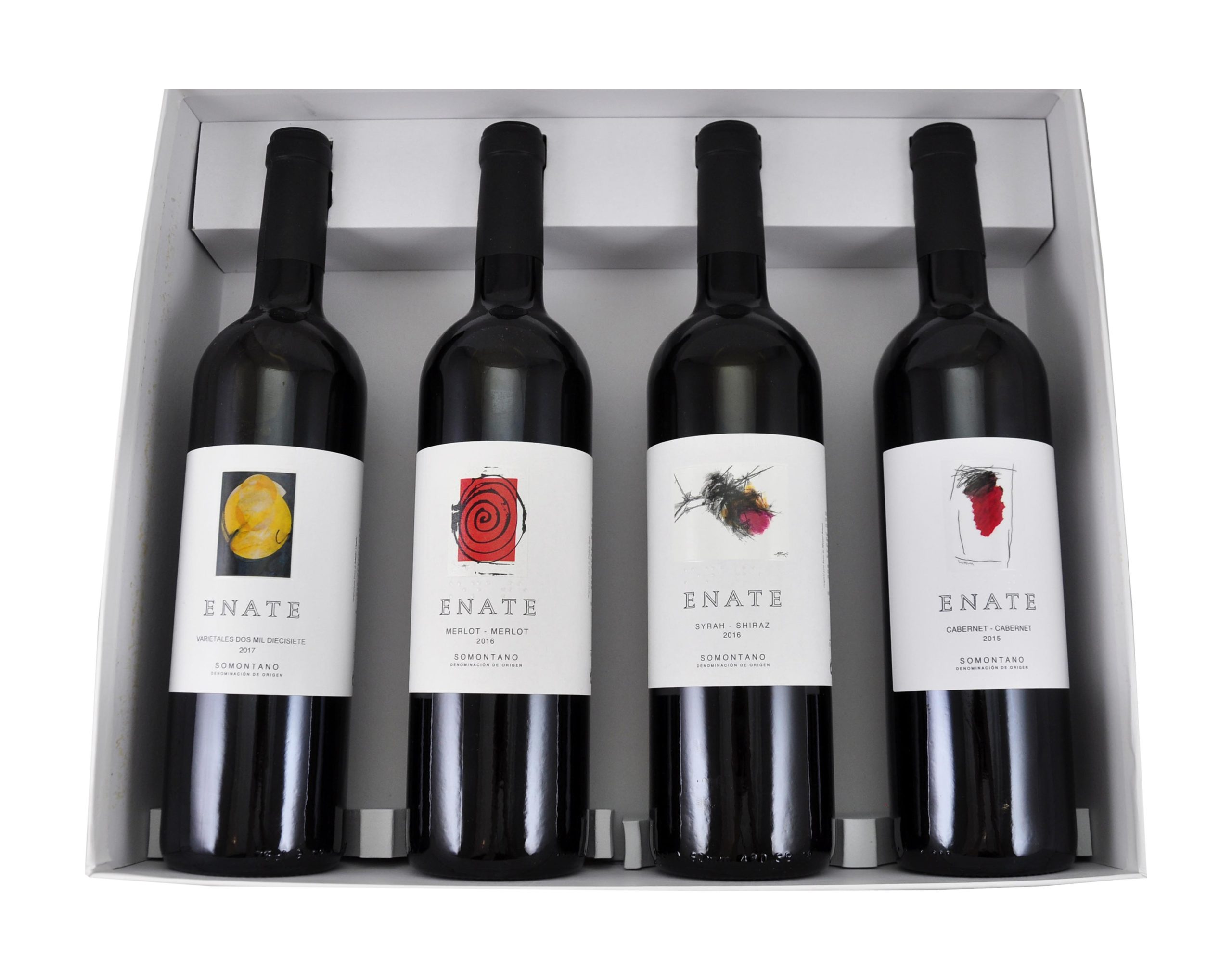 ENATE celebra la décima edición de su Beca ENATE con un estuche de edición limitada de dos botellas numeradas con etiqueta del artista Jorge Fin, ganador de la última edición, que incluye: